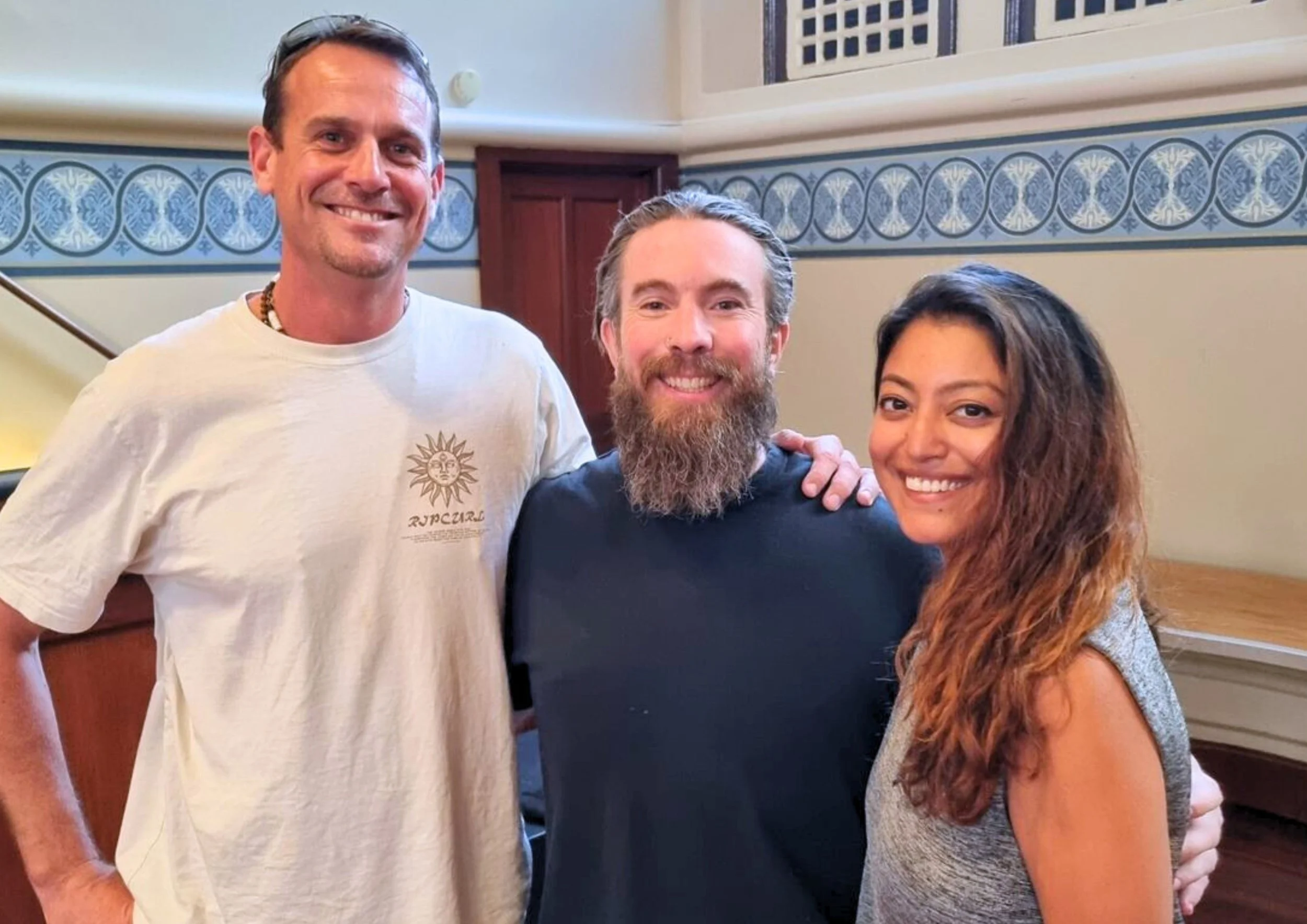 Kai McGuinness (left), Victoria McGuinness (right) with Tim Morrison (centre) at the Perth Town Hall SPIRITUS Breathwork + Soul Flight Weekend Session in March 2024.